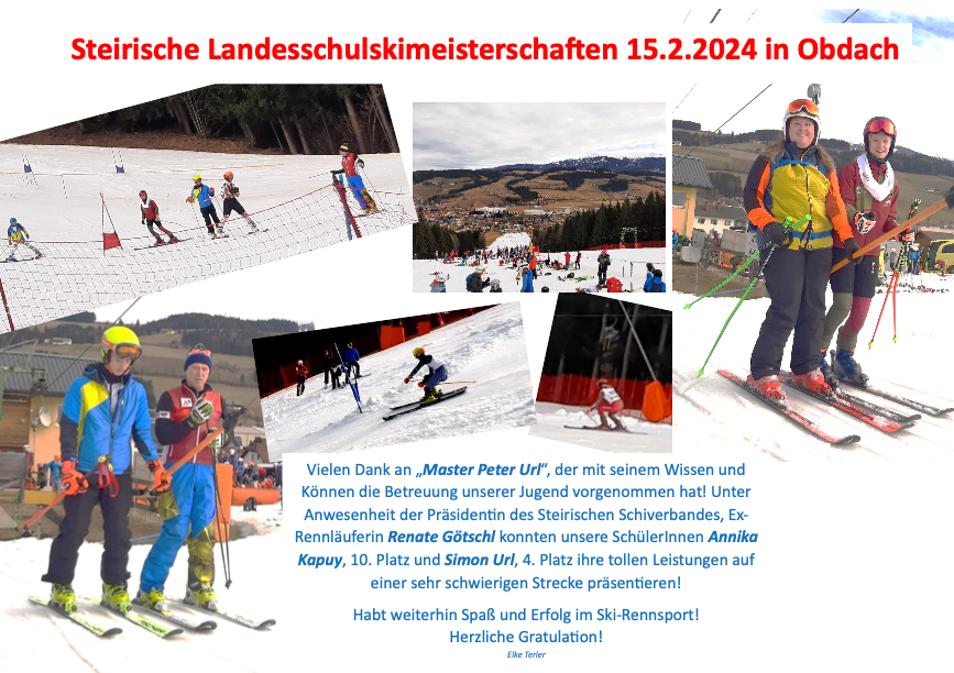 Auch einige Schülerinnen und Schüler der MS St. Barbara nahmen bei den Schulskimeisterschaften am Stuhleck teil und konnten ihr Können einmal mehr unter Beweis stellen. Mit großer Aufregung und Anspannung aber auch viel Spaß und guten Pistenverhältnissen fuhren unsere Schülerinnen und Schüler ein großartiges Rennen und konnten tolle Erfolge erzielen. Wir sind stolz auch euch und gratulieren euch dazu recht herzlich. Ein großer Dank an Kollegin Terler für die Organisation und Unterstützung unserer Skifahrerinnen und Skifahrer.